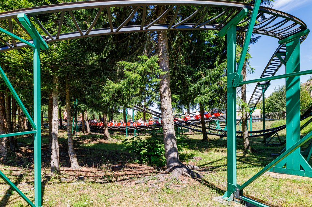 Die Marienkäferbahn ist eine der drei Achterbahnen im Fort Fun Abenteuerland. Sie könnte den Preis für "Wie baue ich eine lustige Achterbahn auf möglichst wenig Raum von Bäumen umgeben?" gewinnen.