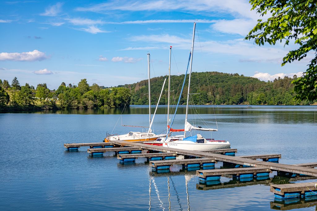 An der Listertalsperre liegen einige Boote an.