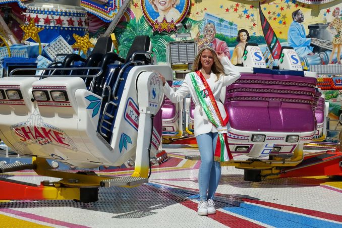 Die gestern auf der Cranger Kirmes inthronisierte Kirmeskönigin Pauline I. bei ihrem ersten Pressetermin vor dem Fahrgeschäft „Shake ’n’ Roll“.