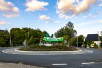 Der 2018 fertiggestellte Krugmann-Kreisel naben der Stadthalle. Die Metallstelen weisen die Namen der abzweigenden Straßen aus. © ummeteck.de - Christian Schön