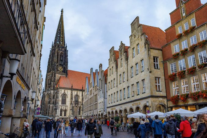 Die Sankt-Lamberti-Kirche mit dem Prinzipalmarkt in Münster. © ummeteck.de - Christian Schön